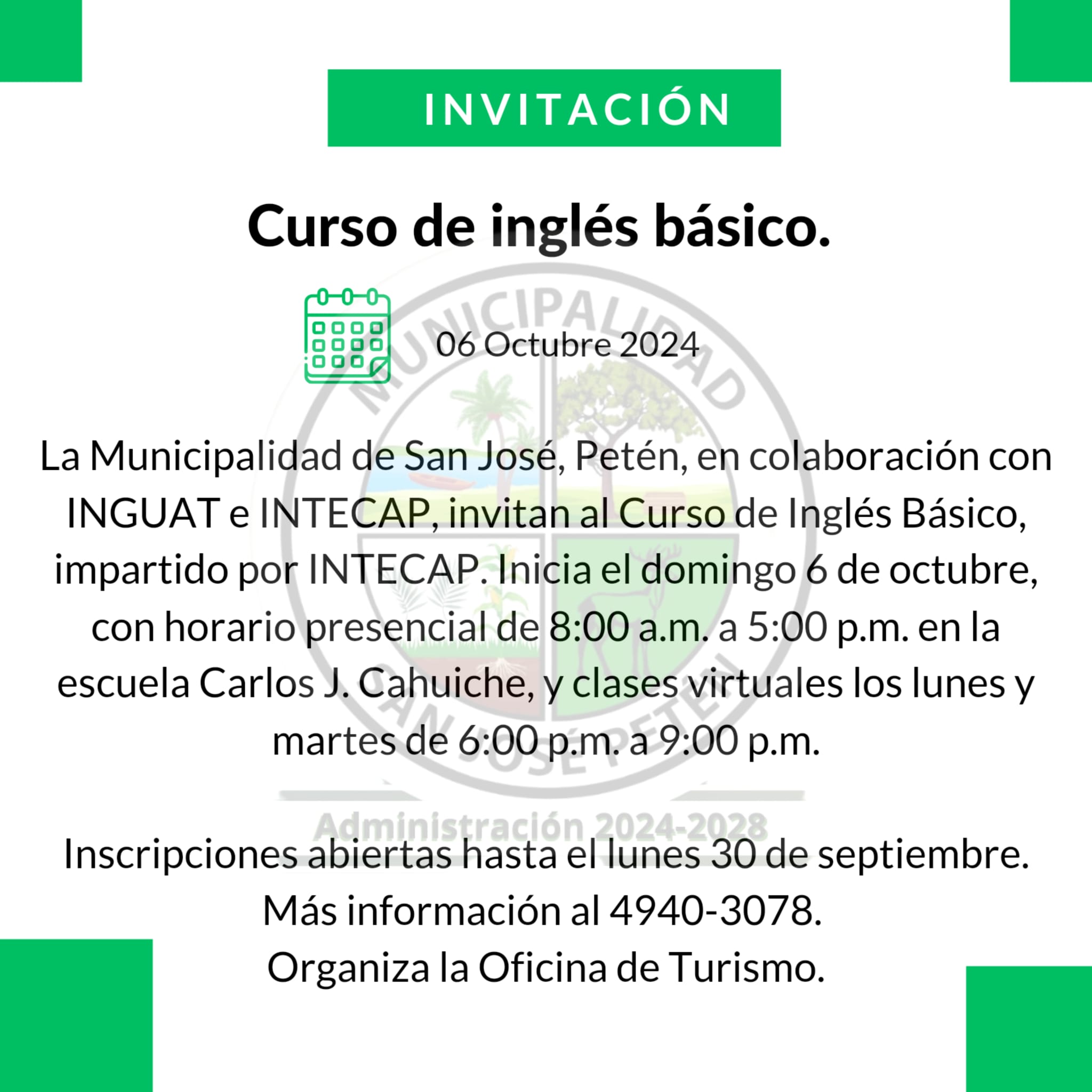 La Municipalidad de San José, Petén, en colaboración con INGUAT e INTECAP, invitan al Curso de Inglés Básico, impartido por INTECAP, exclusivamente para los jóvenes mayores de edad del casco urbano y áreas aledañas. Inicia el domingo 6 de octubre, con horario presencial de 8:00 a.m. a 5:00 p.m. en la escuela Carlos J. Cahuiche, y clases virtuales los lunes y martes de 6:00 p.m. a 9:00 p.m.